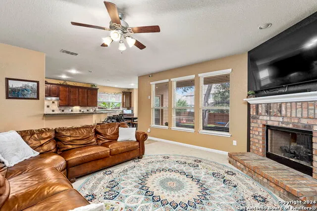 Imagine stepping into a home where every detail exudes elegance, starting with fabulous curb appeal in the heart of the vibrant Alamo Ranch community. This 5 bedroom, 3.5 bathroom residence opens to a grand entryway that leads to a versatile flex space, perfect for a formal living or dining area. A striking brick fireplace anchors the grand living room, creating a warm, inviting atmosphere. Overlooking this space is a chef's kitchen equipped with stainless steel appliances, sleek countertops, an island, and bar seating, complemented by a cozy breakfast nook with additional storage and a planning area. The relaxing primary suite features a tray ceiling and an en-suite bathroom with dual vanities, a luxurious tub, a separate shower, and expansive closet space for ultimate convenience. A loft area and additional bedrooms offer plentiful space for household and guests upstairs. Outside, a covered patio overlooks a serene backyard with a mature shade tree and lush grassy area, ideal for outdoor enjoyment. Located mere moments from the shopping and dining experiences of Alamo Ranch, this home perfectly blends sophistication with comfort, making it a perfect setting for quiet relaxation and vibrant entertainment.