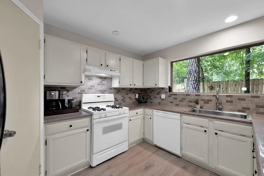 Welcome to this beautifully updated single-story home in the Village of Indian Springs, centrally located in The Woodlands. The foyer leads into the formal living and dining areas, with luxury vinyl plank flooring and low-e windows, creating a stylish and functional space perfect for entertaining. The kitchen includes granite counters, ample storage, walk-in pantry, and a HUGE picture window overlooking the backyard, filling the space with natural light. The kitchen opens to an extended family room featuring a wood-burning fireplace and a cozy breakfast nook—perfect for everyday meals and gathering. The private owner’s suite offers dual sinks, granite counters, and a walk-in shower. Two secondary bedrooms share an updated full bath. Step outside to a large deck, low-maintenance landscaping, and mature pine trees. Located near top-rated schools, parks, shopping, and dining, this home offers both comfort and convenience. Don’t miss the opportunity to make this beautiful home yours!