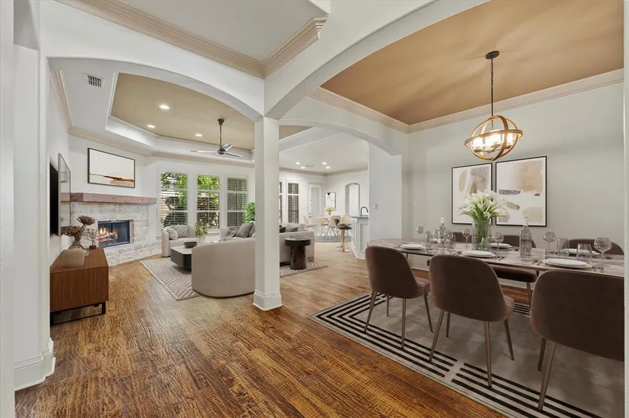 Stunning 4-bedroom, 3-bath custom stone & brick home located in a resort-style community with amenities such as swimming pools, tennis-pickle ball courts, park, playground, community center, & 18-hole golf course. Prime location near excellent schools, shopping, & beautiful Lake Ray Hubbard. Hand-scraped hardwood floors grace most of the downstairs, enhancing the open floor plan. Gourmet kitchen features granite countertops, a breakfast bar, custom cabinetry, a walk-in pantry, & stainless steel appliances, flowing into the breakfast area. The family room showcases a beautiful stone fireplace, while the dining room is ideal for gatherings. The owners suite & guest suite are on the first floor, with two spacious auxiliary bedrooms upstairs open onto full bath. The second living area-game room opens onto an expansive media room. Relax in the screened-in Florida room overlooking the fenced backyard with mature trees & landscaping. 3 car garage & drive provides ample parking. So much more!