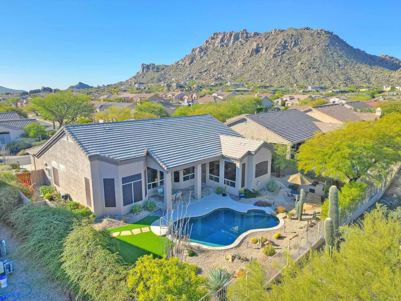 Beautifully updated home in Four Peaks at Troon Village boasts an elevated position on a tranquil cul-de-sac, offering views of Troon Mountain and sweeping panoramas of Four Peaks and McDowell Mountains. The home is within walking distance to miles of hiking and biking trails in the McDowell Preserve. Constructed by Shea Homes, the thoughtfully designed 2,248 square foot residence features a well-appointed split floor plan with four bedrooms and two bathrooms and features 12' ceilings throughout the house. The home was extensively updated in 2022. Kitchen and baths were remodeled, new Italian floor tile was installed throughout the house, hardware was updated, the interior was repainted, and electronic interior window shades were added.