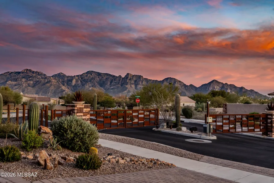 Contemporary style 3 BD 3 BA home situated on an ''oversized'' corner lot with southern exposure, un-restricted views of the Catalina and Tortolita Mountains backing to the ''Vistoso Trails Nature Preserve'' in the highly sought after peaceful gated community of Rancho Vistoso Highlands in Oro Valley. This gorgeous home is pristine and ''like new''with 3-4 bedrooms, 2.5 Baths, Gourmet Kitchen, Den, ''Teen room'' or ''Man Cave'', oversized 2 Car Garage with Epoxy Floors. Exterior features include a wonderful Towered Courtyard with Security Gate and matching Security Door, Stone Exterior with Rain Gutters and Downspouts, Paved Courtyard with Breathtaking Mountain views. The Bronze/Copper Garage Door is stunning! The upgraded mature ''Boulder and Cactus'' landscaping package is beautiful!