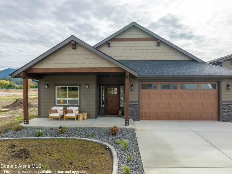 3 bedroom, 2 bath home. As you walk up to the house, you'll be impressed by the stained and lacquered main entry door under a covered front porch, as well as the exterior fiber cement lap siding with timber accents, full front yard landscaping with hydroseed, sprinklers, and curbing, wood-grained insulated steel overhead garage door surrounded by stone wainscot, full rain gutters, and a covered back patio. Inside, you'll find a vaulted great room with a fireplace, a kitchen with an island and breakfast bar, GE stainless steel appliances, Huntwood custom cabinets, granite/quartz countertops, and a walk-in pantry.