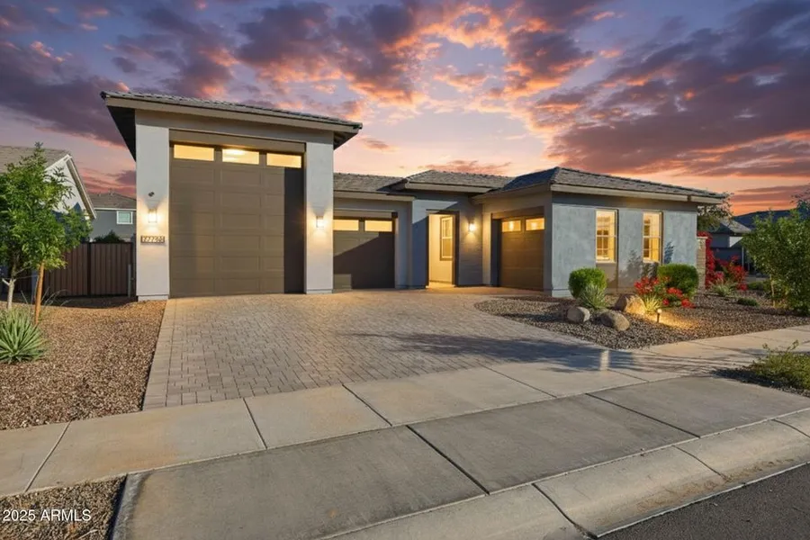 Stunning single-level Desert Modern home in Madera, Queen Creek, offering 3 bedrooms, 2.5 baths, a den, and a dream garage with an attached RV bay featuring two single-car spaces. Open-concept layout with soaring ceilings, abundant natural light, and 8''x40'' wood-look tile throughout. The executive kitchen showcases an oversized island, 36'' gas cooktop with vent hood, double ovens, stainless steel appliances, Hana Sky quartz counters, designer backsplash, and rich Winstead maple cabinetry that extends through the dining area for ample storage. The primary suite includes a soaking tub, custom tile shower, dual sinks, and walk-in closet. Features include a 16' center pull slider, faux wood blinds, upper laundry cabinets and a large backyard ready for your design. Elegant, functional, and perfectly located in one of Queen Creek's fastest-growing communities.