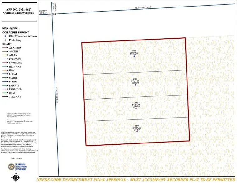 4 re-platted lots ready for new construction home project - total 10,000sq. ft. 2320 Staples St is part the four separate lots, each with 2,250 sq. ft. of ground space. The property is situated in a prime location with new construction in the area, and the adjacent lots are:2316 Staples St2318 Staples St2322 Staples StEach lot is approved by the city with plans and ready to dig.