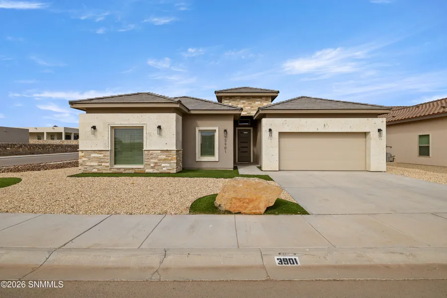 Own the builder's model home in Red Hawk Estates with no HOA, located on a premium corner lot just minutes from the brand-new Red Hawk Golf Course clubhouse. This stunning modern home offers 4 bedrooms, 3 bathrooms, a 2-car garage, and 2,368 sq ft of living space with extensive upgrades throughout. The exterior features a fully pitched tile roof and authentic imported Cantera stone installed by true masons. Inside, enjoy an open-concept layout with coffered ceilings, recessed lighting, a sleek electric fireplace, and tile flooring throughout the main living areas. The chef's kitchen includes a large quartz island, gas cooktop, stainless steel appliances, custom cabinetry, and designer finishes. The primary suite boasts a spa-style bath with dual vanities, quartz countertops, matte black fixtures, a freestanding soaking tub, oversized tiled walk-in shower, and large walk-in closet. Additional highlights include a dedicated office, spacious laundry room with cabinetry, and cohesive designer finishes.