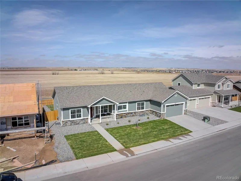 Beautiful ranch style home with mountain views in Blackstone Ranch! Newly completed in November, 2021 with multiple upgrades, your new home features 9 ft ceilings, 42" upper cabinets, soft close cabinet doors and drawers, stainless steel appliances with gas range, granite countertops, stylish hexagon tile backsplash, undermount sinks, subway tile shower surrounds, and luxury vinyl plank flooring throughout the living area and dining room. Everything you need is on the main level including a large laundry / mud room and primary suite complete with 5-piece bath and walk-in closet. Great floorplan with generous living space, a full basement, and 3,560 total sq. ft. Abundant storage and parking with an additional 940 sq. ft. four car garage. Enjoy your morning coffee on the covered front porch and relaxing evenings with a beautiful sunset view from the expansive, private backyard. Convenient location near amenities, rec center, schools, and community park. Easy commute to Buckley AFB, Anschutz Medical Campus, Southlands Mall, Aurora, and Denver International Airport. The final phase of Blackstone Ranch is sold out, secure your new home today. Welcome home!