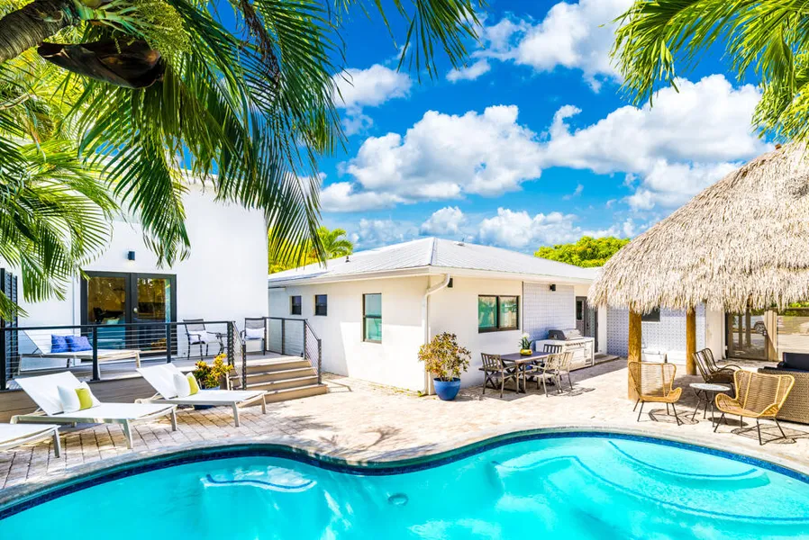 Tranquil Midtown Estate feels worlds away, while just minutes to delectable dining and nightlife in exciting Key West! Nestled on nearly a quarter-acre of gated, lush tropical gardens, this spacious 3/3 main house plus 1/1 guest house comes move-in ready; boasting elevated coastal design where modern finishes and amenities meet relaxed sophistication. Indulge in year-round temperate weather from a backyard oasis, masterfully outfitted for hosting memorable gatherings with a well-equipped outdoor kitchen with gas grill, gas burner, ample prep space and beverage cooler. Lounge poolside, cocktail in hand, in the shade of a large tiki hut and cool off in the stunning resort-style pool, complete with fountain waterfalls! Additional exterior features include brick paver pool deck and outdoor rain shower. Upon entry, the main house features an open-concept great room with walls of impact glass windows and doors, providing abundant natural light. The immaculate Chef's Kitchen, with quartz countertops, glass tile backsplash, premium stainless-steel appliances, and island with seating, allows for effortless entertaining. As a bonus, a Dutch door leads to a spacious butler's pantry with laundry. The primary suite enjoys privacy in its own wing, and comes equipped with luxurious en suite, walk-in closet, and access to a private garden. The separate guest wing offers two expansive bedrooms and two full bathrooms. The well-appointed guest house offers two floors, with living room and kitchenette on the main level, complete with serene pool views and impact glass doors leading out to a private, poolside composite deck. The upstairs guest bedroom offers loads of privacy and en suite bathroom. Enjoy an abundance of covered parking with two pergola carports and additional off-street parking. Located within a quiet, established neighborhood but in proximity to restaurants and convenience stores in town, this ideal location offers the best of both worlds!