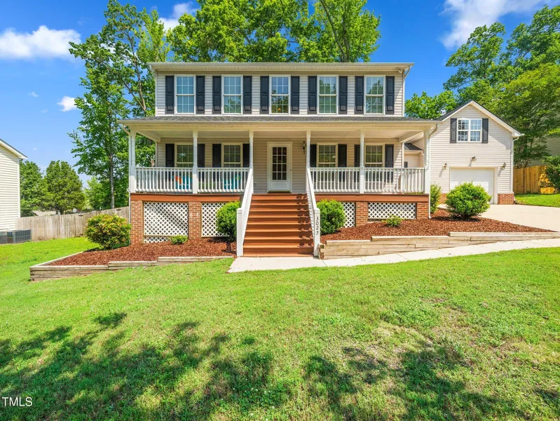 Charming Two-Story Retreat in Wake Forest. Welcome to your dream home nestled in a serene and tranquil setting in beautiful Wake Forest. Just 12 minutes from major shopping and Triangle Town Center, this inviting two-story residence blends peaceful suburban living with unbeatable convenience. From the moment you arrive, the charming rocking chair front porch sets the tone for relaxed Southern living. Step inside to an open and airy floor plan filled with natural light and stylish upgrades. The spacious living and dining areas boast brand-new luxury plank vinyl (LPV) flooring that flows seamlessly into the heart of the home—a stunning, fully renovated kitchen. Here you'll find brand-new granite countertops, a new LG electric range, sleek stainless steel sink, and all-new cabinetry that elevates both function and style. The primary owner's suite is conveniently located on the main floor, offering a private haven of comfort and ease. Upstairs, you'll find three generously sized bedrooms and a versatile loft—perfect for a home office, playroom, or media space. Additional storage is available via a pull-down staircase leading to a spacious area over the garage. Enjoy quiet mornings or evening gatherings on the expansive rear deck overlooking the natural surroundings. For added convenience, the property includes a detached 8 x 16 storage shed—ideal for gardening supplies, lawn equipment, or seasonal decor. And for those warm summer days, the neighborhood pool just down the street offers the perfect retreat—included in the quarterly HOA dues. A new roof was installed in 2021, adding peace of mind to the list of updates in this thoughtfully maintained home. Whether you're entertaining, relaxing, or simply enjoying the comfort of your surroundings, this home offers it all. Nearby Greenway Trails to enjoy nature. Come experience this Wake Forest gem where charm, space, and location come together to create the perfect place to call home.