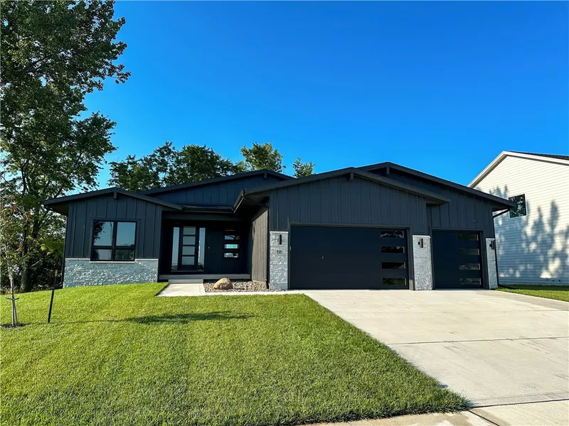 Stunning mid-century modern inspired ranch home by Cosgriff Development on a rare cul-de-sac development in Waukee! When you enter the home, you will be greeted by a large open concept great room to kitchen & dining area featuring large windows to allow in an abundance of natural light. The kitchen features white cabinetry with a 10' white oak island, quartz countertops, a large walk-in pantry with grocery door to garage, & is right off of the covered back deck overlooking mature trees in the backyard. The great room features a full stone fireplace flanked by built-in cabinets & floating shelves. Just off the kitchen you'll find the large owner's suite with double vanity, soaker tub, large full-tile shower, separate toilet room, & walk-in closet with custom trim built shelving & access to laundry. Rounding out the main floor are 2 additional bedrooms, full bathroom with tile tub shower, ...