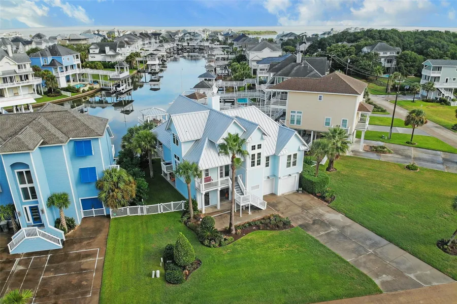 This exceptional waterfront residence is ensconced on a premier oversized lot at the elbow of 2 canals in Galveston’s most prestigious bayside neighborhood- Laffite’s Cove, also known as the “Texas Hamptons”. It boasts panoramic vistas of serene canals, mesmerizing sunsets, the glorious azure pool & spa & the renowned 35 acre Laffite’s Cove Nature Preserve. Lush tropical gardens, sprawling manicured lawns & soaring sabal palm trees enhance this captivating custom home. Exquisite designer finishes, wide plank Italian porcelain tile floors, strikingly impressive 11 foot ceilings, Hunter Douglas remote-controlled power translucent shades, custom ceiling fans (indoor & outdoor), extensive adjustable “eyeball” art lighting, beadboard wainscoting, custom built-ins, majestic cathedral ceilings, numerous French doors, a sophisticated ADT “smart home” system, a Bose outdoor audio system, electric storm shutters & a storm resistant, low maintenance metal ribbed roof are prominent throughout this extraordinary home. Transom windows & large picture windows bathe every room in natural light. The fabulous open-concept floorplan flows seamlessly amongst the various indoor entertainment spaces & out through French doors to the expansive covered veranda & the delightful boat house gazebo which overlook the sparkling pool & spa & the tranquil canals - ideal for “al fresco” dining & sophisticated coastal entertaining! The grand great room & the divine dining room featuring a commercial grade wine & beverage cooler (included) adjoin the chef’s kitchen. The stellar peninsula kitchen is appointed with high-end retro-inspired Big Chill appliances trimmed in beach blue enamel (including a 30,000 BTU gas range and convection oven, a custom vent hood & a sizable 20.5 cu. ft. refrigerator offering LED interior lighting), gorgeous Silestone counters, mosaic tile backsplashes, an elongated L-shaped breakfast bar (seats 6), a small appliance “garage” & glass-front custom cabinetry.