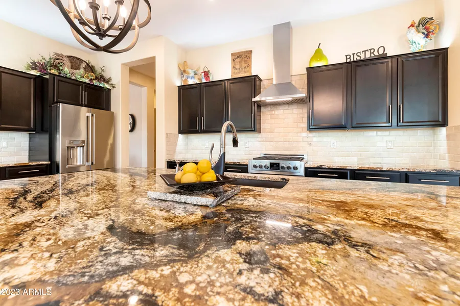 Hard to find Concert plan is an entertainer's delight. Beautifully situated on a corner lot, & backs a walking path, offers 3,194 sq ft of livable space & 2.25-car garage (room for a golf cart). Includes 2 En-Suites, both with W-I closets, custom organizers, raised vanities & Magma Gold granite counters, a dining/ flex rm, den, a spacious great rm with a stacked stone fireplace & multi-slider which opens to the expanded travertine paver patio with extended B-I bbq island along + gas fire pit. The kitchen offers an abundance of cabinetry, a lg dbl-sided island with extensive Magma Gold granite counters, a dual fuel Fulgor range & SS appliances. 2nd multi-slider opens to a pergola covered travertine patio. This home has many extras! Encore, an award winning 55+, offers clubhouse +++++ Bocci ball, pickle ball, tennis, heated pool (with lanes) & spa. Also work-out facility, craft room, billiards, Proving Ground Cafe, and many groups to join!
