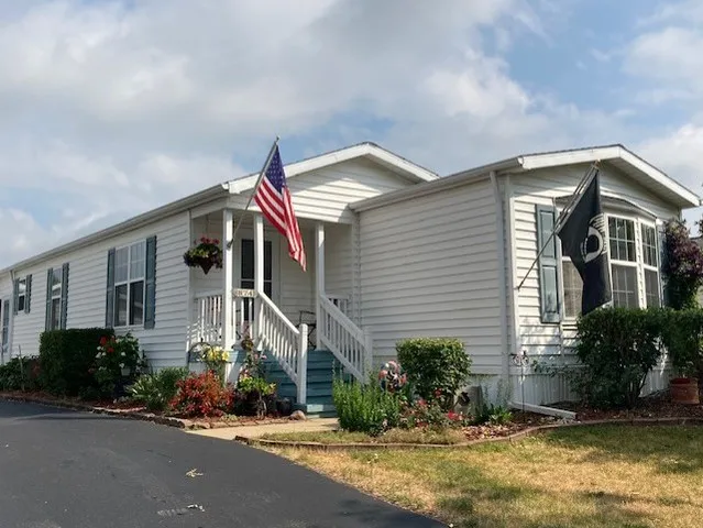Retirement living can be enjoyed in this 55+ adult community! Two bedroom, 2 bath manufactured home has attractive living room and dining room combo with cathedral ceiling~a den/office for privacy~ spacious kitchen with sooo many cabinets and countertop areas...even built in china cabinet..and don't forget bay window~ appliances stay~ double closet in master bedroom~awesome, attached room between house and garage is perfect for relaxing/extra entertainment space~interior freshly painted~ Newer wood laminate flooring and newer carpeting for easy upkeep~hand railings in hall and grab bars in bathrooms extra safety features~1+ car garage~front and back decks~ nicely landscaped yard~Monthly fee includes rent, sewer,water,garbage and basic cable TV~You WILL be happy to call this home and community YOURS!