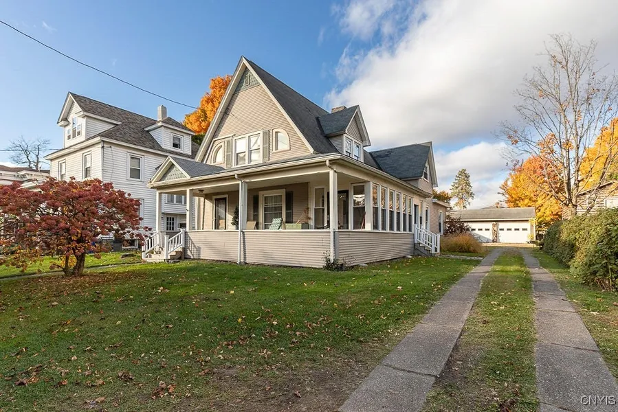 Welcome to this beautifully preserved historical house, offering 1,667 square feet of inviting living space. Featuring three spacious bedrooms on the second floor, plus an additional first-floor bedroom. The finished attic serves as a versatile bonus room, ready to be transformed into your dream space! Step inside to discover stunning original hardwood floors and an elegant wood staircase that exudes character. The open kitchen boasts an island and eat-in area, seamlessly flowing into the dining room, family room, and living room—ideal for gatherings. You'll appreciate the convenience of two full bathrooms, one on each floor, with laundry facilities located in the first-floor bathroom. Enjoy the great outdoors from the newly-windowed enclosed porch or relax on the charming front porch. The private backyard is perfect for entertaining! The two-car garage offers ample storage and extra space for an exercise area, office, or entertaining. Recent updates include two mini-split units, a hot water heater, and a boiler combo, ensuring comfort and efficiency. Don’t miss this unique blend of historic charm and modern amenities!