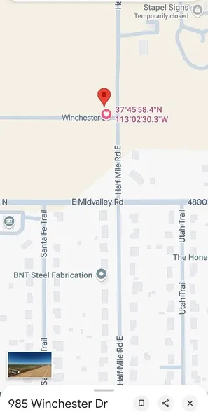 Research Parcel InformationFrom Cedar City, Headed North on Minersville Hwy, at the roundabout, take your 1st exit and head East on Midvalley Rd, turn left onto Half Mile Rd, take your first left onto Winchester, property is on the right.