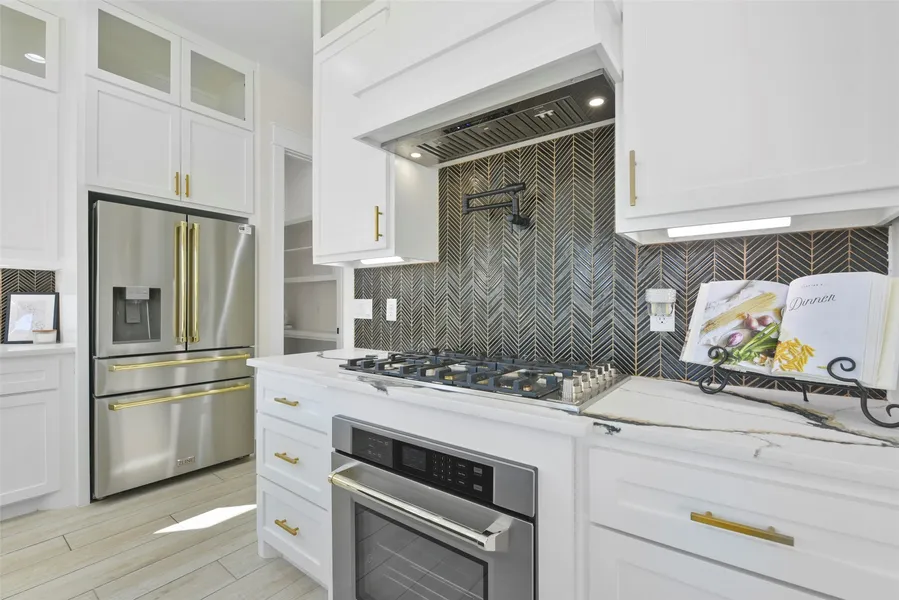 Welcome to this exquisite 4-bedroom, 2.5-bath home that seamlessly combines modern elegance and thoughtful design. The spacious primary suite offers a tranquil retreat with a soaking tub, tiled shower, and double vanity. The living room features wood-beam ceilings, a gas fireplace, and built-in cabinets, creating a warm, inviting space. The chef’s kitchen is a showstopper, boasting Z Line appliances, a gold sink, pot filler, ceiling-high soft-close cabinets, and a large island perfect for entertaining. Custom shelving in the pantry and ample laundry room cabinetry with a built-in sink add convenience and style. Step outside to a covered patio with wood beam accents, ideal for relaxing or hosting gatherings, overlooking the expansive lot. Modern fixtures, luxurious finishes, and a seamless blend of functionality and charm make this home a true gem. Don’t miss the opportunity to call this ...