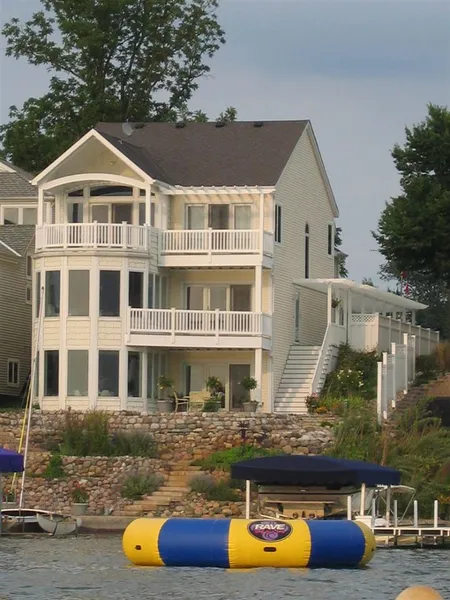 Fabulous view from this contemporary 2 story with walk out lower level on waterfront lot on wonderful Lake Wawasee/ white painted woodwork on the main floor & LL/ open concept living room, dining room, & kitchen with wood floors/deck off main floor/ hickory cabinets/ stainless steel gas range & microwave, dishwasher & subzero refrigerator/walk-in pantry/laundry room with utility sink/tile floor in HB/ natural woodwork- 2nd floor/ master bedroom-cathedral ceiling-opens to covered balcony, walk in closet /MBA- Jacuzzi, tile shower, 2 sinks, water closet/ 3 guest BRs, 2 full baths & 2 half baths/ whole house fan/lower level:large family room with gas log fireplace, wet bar & frig, home theater with built-in entertainment center, & full bath/ Andersen windows/ oversized garage/ this property includes 2 lots across road: 4304244000900000254 & 430424400006000025 parcel numbers for H & K - each...