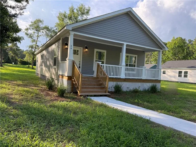 Welcome to 34 Pear Street in the City of Ludowici, GA. Located only 25 minutes from Fort Stewart and Hinesville, this high finish bright open concept floor plan home is the perfect spots to call home. The house has 9' ceilings, crown molding and luxury vinyl plank floors throughout. The open living room and kitchen are perfect for entertaining. The kitchen features granite countertops, all stainless steel appliances (refrigerator included), and an area suitable for a full size dining table. The owner's suite features a walk-in closet, an en-suite bathroom with double vanities and lots of daylight. A large mudroom/laundry room is centrally located with a side entrance to the home between the two additional bedrooms. Built with all Hardie board siding, composite decking, energy efficient systems, windows, insulation and appliances, maintenance on this home will be exceptionally simple! This home comes with a FOUR-YEAR HOME WARRANTY, and the roof is rated to withstand hurricane force winds of up to 140 miles per hour. No HOA! This is Modular Construction built partially in a controlled environment by Impact Housing in Baxley, GA out of high quality materials. This home qualifies for 100% Financing through VA, FHA and Conventional Products. This is also a Georgia Dream and USDA Compliant home!