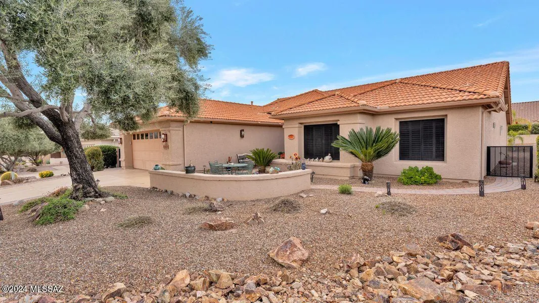 Welcome to this wonderful three bedroom, two bath Montana with views from the front patio & backyard. The corner lot is large enough to add a casita, pool &/or golf cart garage. The private back yard features a southwestern style fountain, built in BBQ, extended patio with aluminum ramada for outdoor entertaining & a screened patio with tile floor & ceiling fans. The updated kitchen includes newer quartz counter tops, custom back splash & four pot drawers in the base cabinetry. Newer appliances in the kitchen & a refrigerator in the garage, along with the washer & dryer will stay. There is a large bay in the eat in kitchen area & the wall in the great room has been removed. Engineered wood flooring & plantation shutters throughout the home. Owner's suite has been expanded with a bay