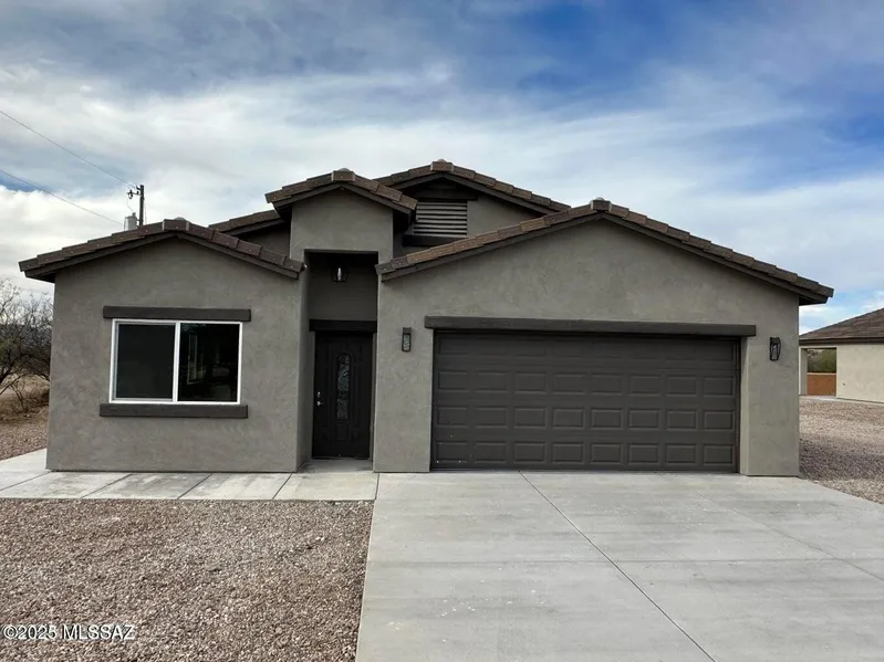 Rio Rico home built in 2022 on a corner lot features a tile roof, covered back patio, four bedrooms, two baths, walk-in closet, den/office, laundry room. Kitchen has granite counters, white cabinets, under mount sink, island, s. s. appliances, high ceilings, ceiling fans. All-electric home, sewer connection. Two car garage, paved driveway. There are no Home Owners Association.