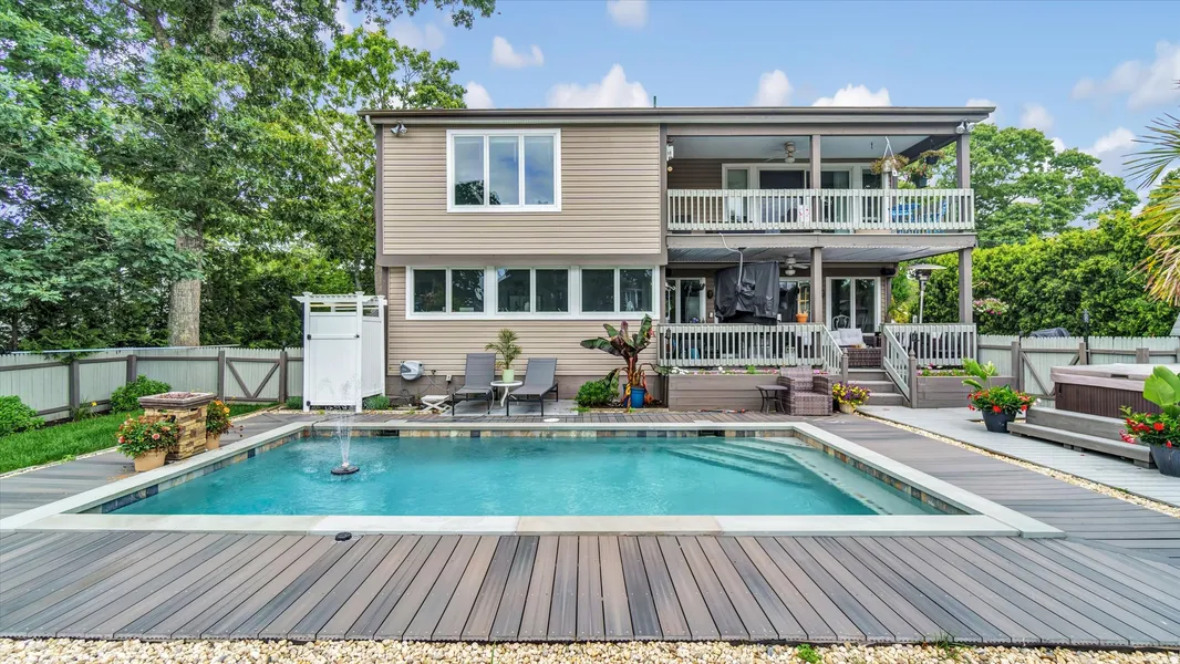 Waterfront Post Modern beauty in Shinnecock Shores. No need for a vacation. Smell the bay breezes as you swim in your heated in ground saltwater gunite pool or relax in your hot tub or hop onto your boat and go fishing. Enter the home into the open living room with gas fireplace, kitchen, dining room and guest bedroom and bathroom with relaxing jacuzzi tub. Ascend the stairs to an additional two guest bedrooms and bath, primary suite with bath which includes a soothing steam shower. It also has an amazing balcony overlooking the lovely yard with lush landscaping and canal with views of Shinnecock bay. Don't miss this amazing opportunity to own a waterfront home!!!