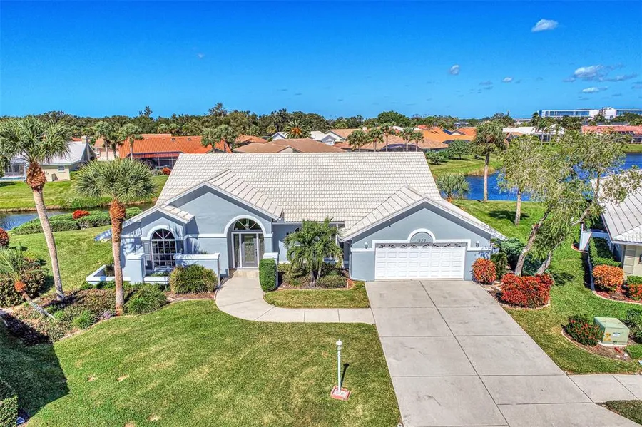 Attractive three bedroom, two and a half bath home with beautiful water views in desirable Waterford Golf Community. This 2500 square foot home has some very unique structural architecture; rounded corner columns, large front entry and arched entries into the living room and dining room. You have a formal living room with a bay window, formal dining room, family room with skylights, kitchen and dinette. There are engineered wood floors in the living areas, luxury vinyl plank in the bedrooms and tile floors in your bathrooms, kitchen, dinette and laundry area. The kitchen features granite counter tops, breakfast bar, wood cabinets, stainless appliances and a closet pantry. There is another closet pantry in the hallway from your kitchen to the dining room. Impact glass sliding doors from the family room and dinette to the brick paver lanai and pool deck where you have an oversized spa (18X8) with gorgeous water views surrounding you. There are many updates to the home by the owners, besides the impact glass sliders, all the windows were replaced with impact glass as well and also the front entry door. Garage door was replaced with storm rated door. The exterior of the home was painted in 2022 along with the garage floor and walls. The AC system was replaced in 2012 along with upgraded duct work. The water tank was replaced in 2022. Be a part of this great community where golf membership on the 27 hole championship course is voluntary. The Waterford community amenities include a large heated pool and spa, clubhouse, fitness room and tennis courts. Come see this beautiful home today!