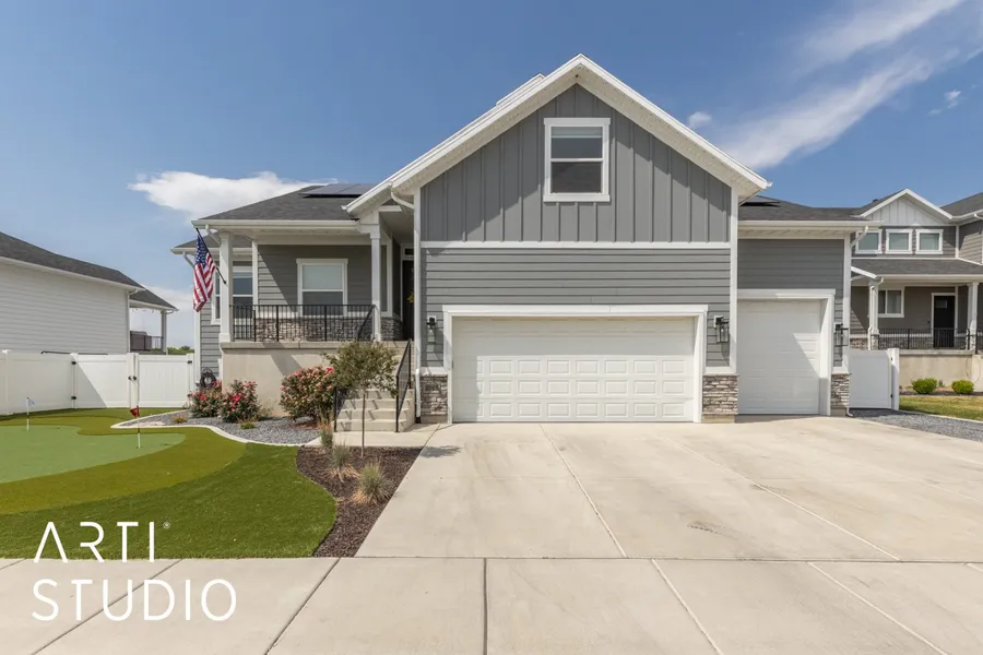This stunning rambler offers luxurious main-level living with exceptional amenities and impressive potential rental income. The main house boasts 4 bedrooms and two full bathrooms, 3 bedrooms on one level for convenient single-level living, and a bedroom in the loft/bonus room. A chef's dream gourmet kitchen, featuring Wolf double ovens, a Sub-Zero refrigerator, and a commercial gas cooktop. Enjoy breathtaking unobstructed views of Ben Lomond peak and the Wasatch Front mountain range across from open country fields (and no back yard neighbors) from the large covered Trex deck, or relax on the front covered porch. Inside, a gas fireplace in the living room adds warmth and ambiance, complemented by easy-maintenance LVP flooring and carpet. Upstairs, the huge bonus room/bedroom above the garage offers versatile space, perfect for a guest suite, home office, or recreation room. Beyond the main house, a fully finished Accessory Dwelling Unit (ADU) in the walk-out basement provides significant rental income potential. This ADU features 2 bedrooms, 1 full bathroom, a full kitchen with stainless steel appliances and a large island, laundry room, massive pantry, and separates entrances through the garage and back yard; the walk out has a covered patio and added conveniences include cold storage and a water softener. The home has solar panels (installed 2024) and Jellyfish permanent outdoor lighting (installed 2024). Outdoor features are equally impressive. A professionally installed four-hole putting green adds a touch of fun to the front entrance and the professionally landscaped, vinyl-fenced backyard, which also includes a 12x16 Tough Shed. The oversized four-car garage features an RV door and space the length of the house, a sink, and generator hookup, providing ample storage and workspace. This property offers a rare combination of luxurious main-level living, significant rental income potential, and extensive outdoor amenities, a must see for the pickiest of home buyers.