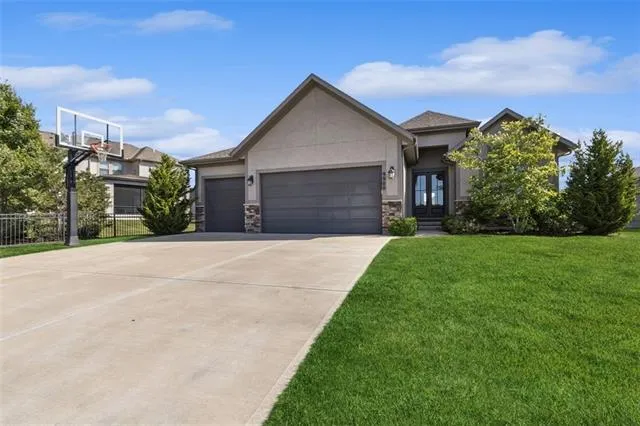 Stop the car--this is the reverse you've been waiting for! Lightly lived inGǪno pets or smoking in this move-in ready home! Step through the stunning double doors onto rich wood flooring and take in the view that sets this home apart--an expansive east-facing backyard that backs to lush green space. The kitchen is a showstopper with a huge island, gas cooktop, corner pantry, and stainless appliances. The Great Room features a striking stone fireplace and beautiful ceiling beams, ready for relaxing or entertaining. The Primary Suite is a peaceful retreat tucked into the back corner of the home, complete with a spa-like bath featuring a large walk-in shower, whirlpool tub, and a custom double vanity with built-in storage. The oversized walk-in closet conveniently connects to the laundry room. A practical drop zone near the garage is perfect for coats, bags, or workout gear. Bedroom 2 is located at the front of the home--ideal for a guest room or home office--with a full bath just steps away. Head downstairs to find your ultimate entertainment zone! The impressive theatre comes fully equipped with seating, screen, and equipment. There's a walk up bar, plenty of space for game tables or fitness equipment, plus two generously sized bedrooms with walk-in closets and a full bath. Enjoy outdoor living with a covered deck and patio below. You will love your lower energy costs here! Construction completed with this in mind! Located within award-winning Blue Valley Schools (Cedar Hills Elementary, Pleasant Ridge Middle, and Blue Valley West High), and just minutes from Bluhawk shopping, restaurants, and entertainment--this home truly has it all!