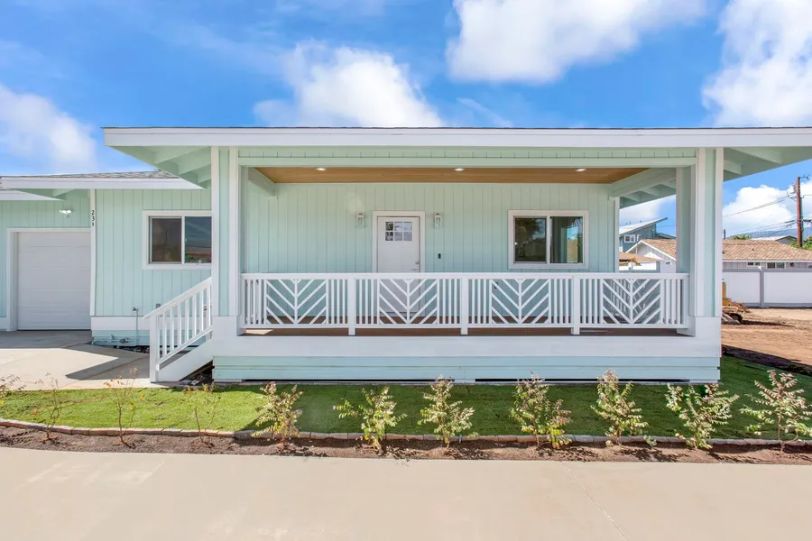 Welcome to Sea Glass Hale - Brand New Cottage with garage in the heart of Kihei!! Move right in to this new construction 2 bedroom, 1 bath home conveniently located in Kihei Town. Clean and light finishes to include off-white cabinetry, granite countertops, luxury vinyl plank flooring, tile, stainless steel appliances, stylish lighting and ceiling fans. Well laid out kitchen has ample cabinets and counter space, along with LG appliances, large sink and even a door that leads to the backyard. Large front lanai with Trex decking and tongue and groove wood ceiling creates extended outdoor living space that is perfect for relaxing or entertaining. Small fenced yard has gate allows for easy access, including fresh laid seashore sod grass in front and back yard with irrigation system. Dual pane windows, extra insulation, washer and dryer, split AC in all rooms, and solar hot water heating are ...