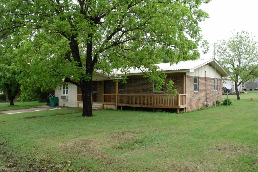 Front porch with railing and new front door with leaded glass add to the curb appeal. Majority of home is brick with siding and metal on north corners where renovations were made to change / add space. Roof is metal. Termite treatment was done before current owners starting renovations.