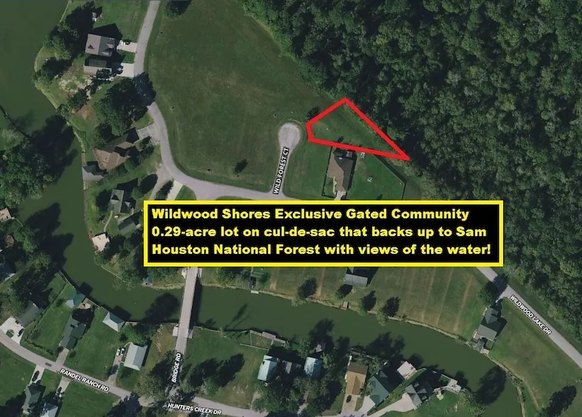 Research Parcel InformationFrom Houston take I-45 North. Take exit 102 for FM 1375 toward TX-150/FM 1374/New Waverly. Go thru the traffic circle & continue onto E Feeder. Turn left onto FM1374. Turn left onto Stubblefield Lake Rd. Slight left onto Gus Randel Rd. Turn left onto Houston Rd. Turn right onto Randel Ranch Rd. Turn left onto Bridge Rd. Turn right onto Wildwood Lake Dr. Turn left on Wild Forest Ct. The lot is located on the right at the back of the cul-de-sac.