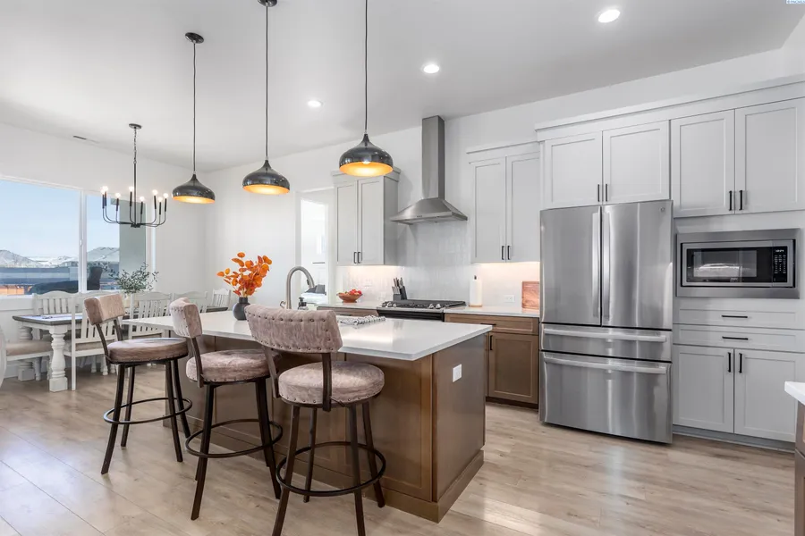 MLS# 289877 Nestled in the beautiful South Kennewick neighborhood of Sage Crest, this 2023-built, single-level home is ideally located near schools, parks, shopping, and everything you need for an active lifestyle. The home offers 2,148 sq. ft. of thoughtfully designed living space with 4 bedrooms and 2.5 bathrooms. Step inside to an open and airy great room filled with natural light, featuring laminate wood flooring, detailed ceilings, expansive windows, and a cozy gas fireplace that creates a warm, inviting atmosphere. The chef-inspired kitchen is the heart of the home, showcasing quartz countertops, a stylish tile backsplash, a large island, abundant cabinetry, and an oversized pantry—perfect for entertaining and daily living alike. The adjacent dining area provides a wonderful space for both casual meals and special gatherings. The primary suite is a relaxing retreat, offering a spac...
