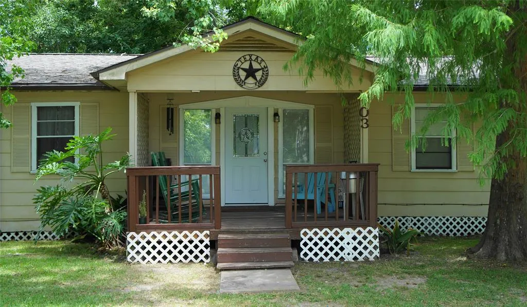 A sweet place in the heart of Anahuac - Fresh interior paint - New plank flooring in the living, dining, kitchen, and hall bath - Large kitchen with plenty of room for more cabinets or a nice piece of furniture - Cabinets are solid wood Small pantry - Master bath has a shower only - Hall bath has a tub/shower with built in storage - Pretty lot - Mature trees - Not much space in the backyard but a deep front and side yard - There is a storage room on the east side of the home that was originally a carport - It houses the washer and dryer - It could be removed or turned back into a carport - Siding on the storage room needs to be replaced - Refrigerator remains - Seller says flood insurance is required - Year built is only a guess - The first recorded sale was in 1999 - Seller said her lender required her to maintain flood insurance - Most recent flood maps show this area is Zone X