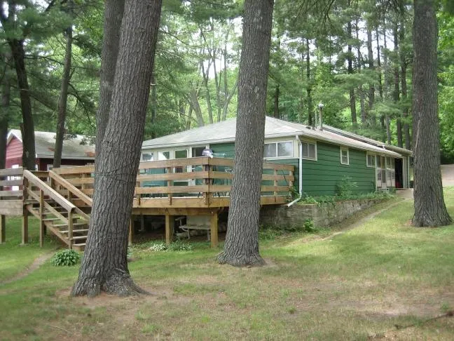 Fantastic Tainter Lake property w/ beautiful views, low access to the water, new, huge 27x16 wood deck on rear/lake side, fun fire pit area near lake, very spacious living room, attached 2 car garage heated and insulated w/ oil change pit, & overall property is in nice condition. Start making fun lake memories today! Top of the line aluminum dock included, patio heater is included, & pontoon is also available for sale.