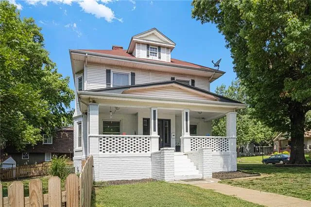 Spacious Kansas City Shirtwaist with finished daylight basement is move-in ready. Beautiful mix of old and new from the original hardwood floors and lavish 1920s trim to the new carpet and fresh paint inside and out. Greet friends and neighbors from the covered front porch or formal entry. HVAC has been updated and is 14 months young. (Radiators are for decoration only) Tons of living space to spread out from the main level living room, sitting room/office, lower level recreation and bonus room. Updated kitchen features ceramic tile floor and backsplash, along with stainless steel appliances. Eat in the sun-filled breakfast room or formal dining room with pocket doors. 5 spacious bedrooms spread between the 2nd and 3rd floors. Finished daylight basement with ceramic tile floor includes a generous recreation room, laundry area, bonus room and unfinished space for storage. Large corner lot with fully fenced yard, patio and detached 1 car garage. Excellent location just blocks away from historic town square.