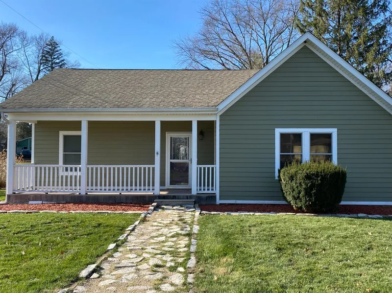 Welcome to your updated, affordable 2BR home in Kouts! As you walk up to the inviting front porch you will enter the oversized foyer and walk into the living room. The primary bedroom suite is adjacent to the living room. The suite contains 2 closets and a 3/4 bath. Down the extra wide hallway is the 2nd bedroom and the full bath. The eat in kitchen has generous counter space and ceramic flooring. All appliances stay. Plenty of closets and storage space throughout the home. Past the kitchen is the enclosed washer & dryer cove. From there you'll enter the family room with an exterior door to a paver patio. The detached garage measures 24 ft. wide X 22 ft. deep. In addition to the garage is an 8 ft. wide by 12 ft. deep tool shed. This corner lot offers plenty of yard space to enjoy outdoor activities. The home is located within walking distance to Kouts schools and library. Drazer Park and the township pool are nearby. Payment with 100% USDA financing would be approx. $865 pr/mo PITI.