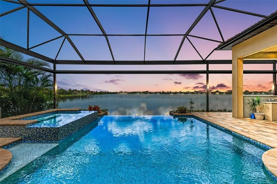 Under contract-accepting backup offers. Step into this luxury residence and be greeted by breathtaking, sweeping panoramic water views. This one-of-a-kind, seldom available, customized Villa Serena with 3BR, Office, and Bonus Room is situated on a stunning 80' expansive Lake Awesome waterfront homesite. The opulent, designer-decorated home is located on one of the most beautiful lakes in the region, offering long, open-water views and total western rear exposure for unforgettable Florida sunsets. The use and placement of windows and pocket sliding doors seamlessly blend the interior spaces with the expansive pool deck, beautiful infinity edge pool, spa, and outdoor kitchen. The extra large 80' homesite is one of only a handful in the community that can accommodate the sought-after, wide-lot Villa Serena floor plan. This residence offers inspired coastal living with uncompromising quality and refined craftsmanship. As you enter, you are drawn to the infinity edge, salt water pool that appears to be flowing into the 60-acre lake behind it. Volume and coffered ceilings, extensive crown molding, rich architectural details, designer lights including a Chihuly chandelier in the kitchen nook, designer fans, and open-concept living are some of the stylish elements in this home. Other features include coastal plank porcelain tile flooring in the main living areas and LVP flooring in the bedrooms. The gourmet kitchen, designed for a chef, is equipped with Monogram Professional built-in appliances, including a 48" built-in refrigerator, 48" professional range with 2 ovens, 6 burners, and griddle top, built-in additional oven, microwave, professional hood vent, beautiful two-tone glazed cabinets, extensive cove cabinet crown molding, under cabinet lighting, designer backsplash, Cambria quartz countertops, a large kitchen island, and a hidden walk-in pantry. The split floor plan offers privacy, with the primary suite spanning the length of the home on the left side. The spacious and luxurious master bath has separate vanities, a makeup counter, a large Kohler freestanding tub, a roomy shower with 2 shower heads, Cambria countertops, modern style cabinets, porcelain tile, a designer listello, and a separate WC with a Toto bidet toilet. This smart home features 2 HVAC units, hurricane-impact windows and doors, a tankless gas water heater, and a 500-gallon, in-ground propane tank, offering a modern and tech-savvy living experience. The roomy lanai provides an eating area with an outdoor kitchen for al-fresco dining. Other features include upgraded secondary baths with a walk-in shower, designer listellos, and quartz and granite counters. The sizeable 3-car side entry garage is air-conditioned, finished with an epoxy slip-free floor, and includes hanging storage racks. Live like you are on vacation all year round. Toscana Isles is a gated, resort-style, maintenance-free landscape community geared towards an active lifestyle. Enjoy kayaking, canoeing, and fishing on over 200 acres of interconnected lakes straight from your backyard. The 8,000sf clubhouse includes a fitness center, ballroom, and billiard room. Toscana Isles offers easy access to beautiful Suncoast Beaches (10 minutes away), the Legacy Bike Trail, and unique Venice and Sarasota downtowns with rich cultural life, excellent shopping, and gourmet restaurants. Sarasota Memorial Hospital Venice campus is just 5 minutes away. Furnishings are offered with the home. Please ask for a complete list. Call today for a private showing!