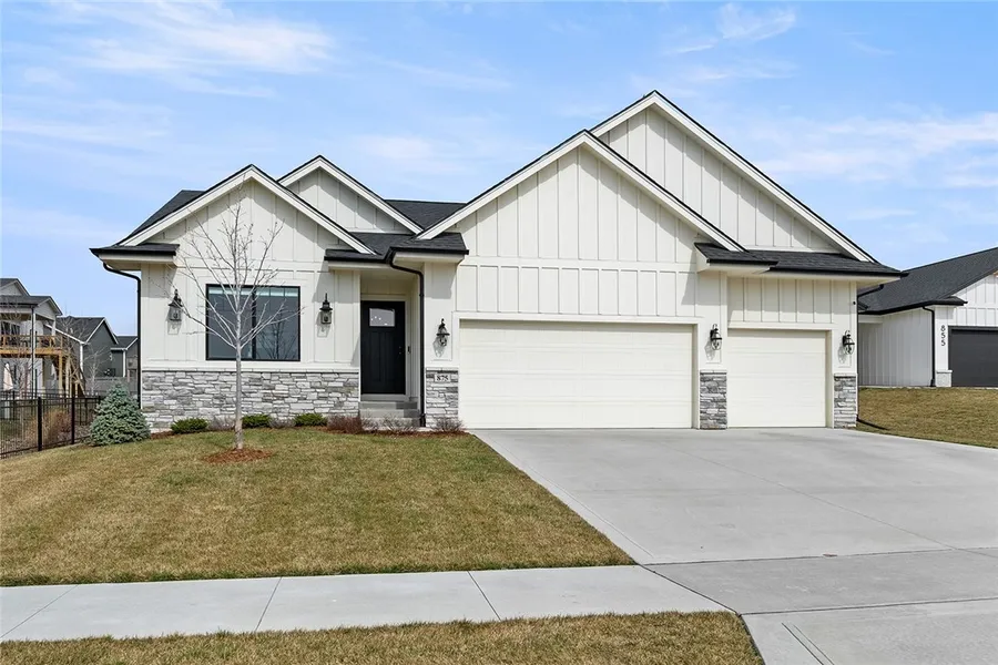 Custom-built ranch home with many upgrades on a 0.32 acre great cul-de-sac lot. Many decorator accents throughout this home including fun light fixtures, bathroom mirrors, and accent-painted walls. Open floor plan with LVP floors and vaulted ceiling through the great room, dinette, and kitchen. Large windows flank the stone-faced gas fireplace in the great room. The kitchen boasts a pantry, white wall cabinetry, stained center island cabinets, quartz counters, tile backsplash, stainless steel appliances including the refrigerator, dishwasher, microwave, and gas stove. Triple sliding doors off the dinette provide access to the deck for easy outdoor leisure in the meticulously maintained and fully irrigated yard that is nicely landscaped. The primary suite features three oversized windows and a charming bathroom and walk-in closet. Two more bedrooms share a full hallway bathroom. Other amenities: nice laundry/mudroom with cubbies, black hardware, Arlo security cameras and video doorbell, humidifier on furnace, passive radon system, washer and dryer included. The garage has insulated walls and ceilings and a natural gas heater. The open rail staircase leads to an unfinished basement that is stubbed for a future bathroom. Less than one block to Sugar Creek Elementary School and less than a block to Sugar Creek Park including pickleball courts, playground, and shelter. Plus easy access to Interstate 80 and convenient location to all the amenities of Kettlestone Waukee.