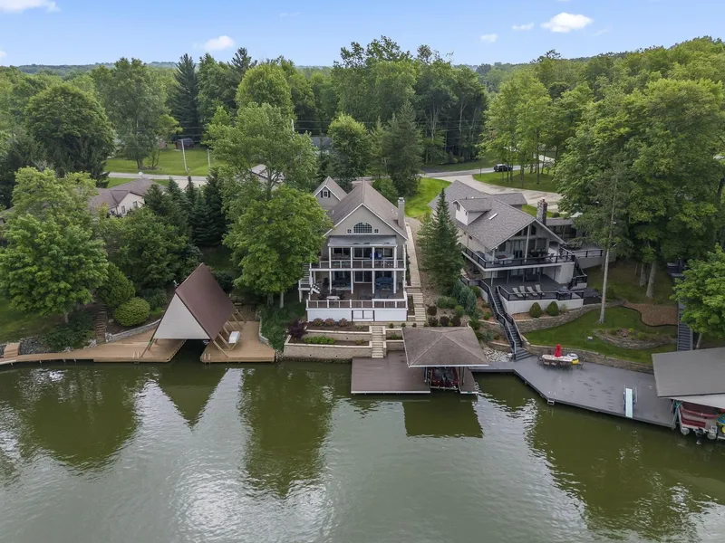 One-of-a kind, fully furnished, breathtaking custom-built lakefront luxury home, in the private gated community of Candlewood Lake! Panoramic lake views and abundant natural light greet you from the soaring and airy vaulted great room, including an open concept kitchen and dining area with high-end stainless-steel appliances, and stone gas fireplace in the living area. Step through the multiple sliding glass doors to experience a large, covered porch with an expansive, elevated view of the largest part of the lake. Upscale finishes are featured throughout, including wood floors in all living areas and ceramic tile in the baths. The first floor features a master bedroom suite, with full bath, including an oversized walk-in shower and dual vanities. An additional combination bedroom/den, a half bath, and a large storage/laundry room, complete the first floor. The lower level showcases a large family room, with a full bar area and an additional three bedrooms and full bath. From the family room, a full wall of sliding glass doors open to another expansive, 1,000 square foot outdoor deck with equally stunning views of the lake. From here, a beautifully landscaped retaining wall system and tiered steps lead down to the oversized private dock with covered, motorized boat lift. Additionally, all outdoor spaces, decks, and dock are covered in composite decking material for maximum longevity and minimal maintenance. With many more custom features too numerous to list, this is a great home ready for entertaining family and friends this summer at the lake. A must see!