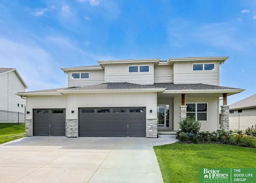 Gorgeous Pine Crest “Haven” 2-story in sought-after Granite Lake! One of the best-priced homes in the area and packed with upscale features from its former model status. The modern exterior opens to a stylish interior with engineered hardwood floors in the kitchen and dining areas, plus wrapped drywall beam ceiling accents in the Great Room. The gourmet kitchen features quartz countertops, a large walk-in pantry, center island, and designer lighting. A cozy fireplace and large windows create a bright, welcoming vibe. The flex room with barn doors adds versatility, and the drop zone keeps daily life organized. Upstairs you'll find four spacious bedrooms, a luxurious primary suite, and a convenient second-floor laundry. the unfinished basement offers potential for a 5th bedroom and added living space. The 3-car garage includes smart door openers. Sitting on a level lot with a stunning view of Nebraska sunsets from your patio. This home blends comfort, style, and incredible value! AMA