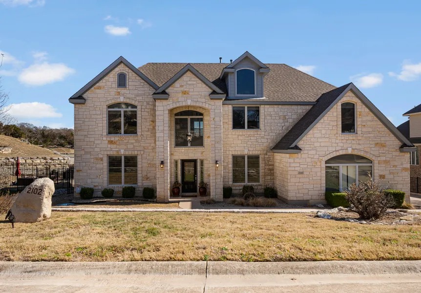Meticulously maintained and functional home in the highly desirable Fairways at Crystal Falls subdivision. Inside this gated community, you will find a wide range of onsite amenities as well as being walking distance to Whitestone Elementary. Beautiful white limestone exterior throughout the outside of the home with modern grey siding and trim provides a timeless and elegant facade. Upon entering this nearly 4,000 sqft home you will be greeted by a gorgeous staircase and original hardwood flooring. Dedicated office on your left as soon as you enter the home with the formal dining & living room area straight ahead. The large family room is open, filled with natural light & enhanced by a cozy fireplace. The kitchen offers ample storage and a great space for all your entertaining events. Spacious owner's suite on the first floor with a large walk-in closet, soaking tub, dual vanities, and a free-standing shower. Additionally, it has direct access to the outdoor patio and the owner's suite has its own fireplace. Large upstairs game room complete with a covered patio with expansive views of the community & Hill Country. Three additional bedrooms and two additional full bathrooms on the second floor. Two full-car garages and a half-bay that's perfect for your golf cart or motorcycle. Ample outdoor space in the backyard and side yard that's perfect for a pool addition and all your summer-filled activities.