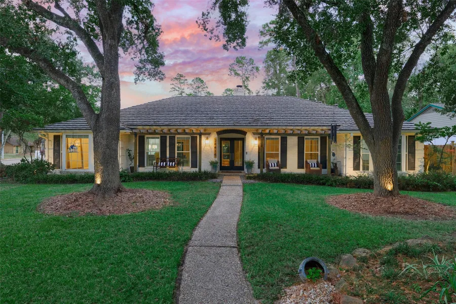 Stunning one-story classic suburban ranch-style home, situated on a spacious corner lot with mature trees. This home showcases both modern elegance (note the glass double front doors) and vintage charm (antique barn door and reclaimed wood features). Living areas bathed in abundant natural light, thanks to skylights and a wall of windows. Bedrooms are privately situated at the end of a long corridor; primary suite even has its own private back porch access. All bedrooms and living areas offer views of the picturesque outdoor space. The yard is professionally landscaped and features multiple seating areas, outdoor LED lighting, a hot tub, a 2020 free form pool, and even a charming little greenhouse. 7 zone sprinkler, french drains, aluminum shingle roof, three car garage, recent double pane windows, and so much more. Convenient to the EXXON campus, The Woodlands, 99, and walking distance ...