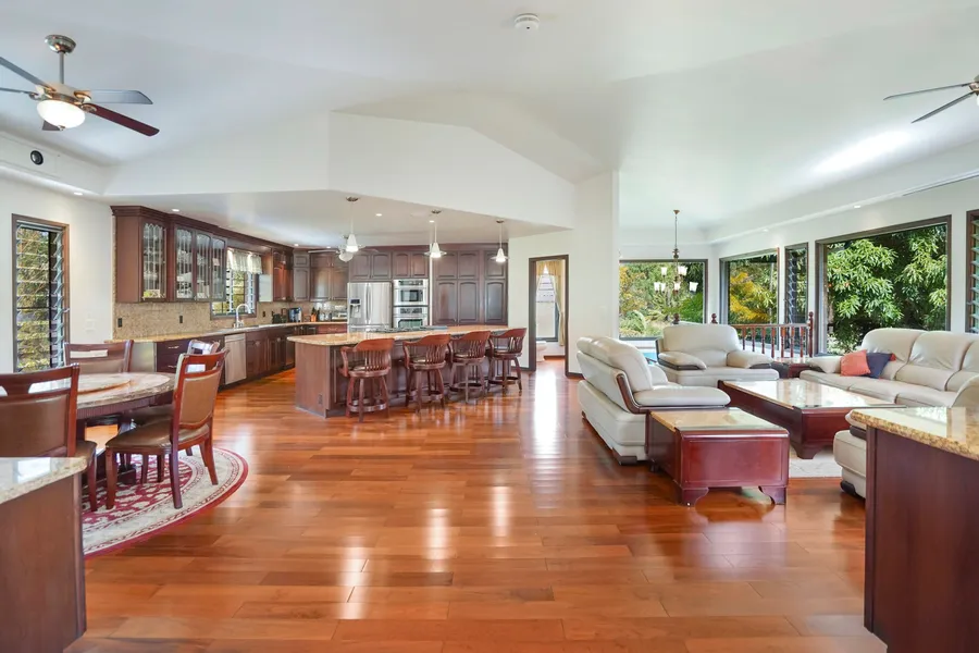 TWO LEGAL DWELLINGS highlight this extremely well-built and beautifully appointed home, showing craftsmanship throughout. The very private location in Niumalu enhances the convenience of being within walking distance to Beach, Yacht and Canoe Clubs, and just minutes to Golf Courses, Airport, Hospital, Costco and a variety of shopping centers. There are 2 water meters and 2 electric meters. UPPER LEVEL: 2 bedrooms, 2.5 baths Large custom kitchen Granite counter tops and cherry wood cabinets Stainless steel Jenn-Air appliances Dumb waiter Spacious living room, dining room and lanai Bathrooms feature etched glass shower doors and windows LOWER LEVEL: 3 bedrooms, 3 baths Large gourmet kitchen Cherry wood cabinets Granite counter tops in kitchen and marble counter tops in bath rooms The upper floor has teak wood flooring throughout - lower floor features tile floors. The home is built of soli...