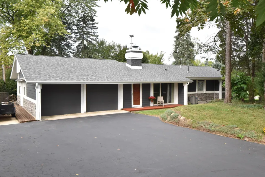This spectacular lake view home in the desirable Lake Shangri-La is a must see. This luxurious contemporary ranch features impeccable finishes throughout, from beautiful, stamped concrete floors, to a gorgeous two-sided natural wood burning fireplace. Architecturally designed for maximum natural light with 6 patio doors. The Master features a large whirlpool tub and a large screened in porch to relax and enjoy the view. The heated two car garage adds tons of storage, attic access and a sink. The exterior features hardie board siding with additional insulation and oversized overhangs for maximum efficiency. The cedar wrap around deck and beautiful landscaping makes this a perfect home for entertaining. Appliances 2018, siding, 2022, roof, 2021. MUST SEE!!!