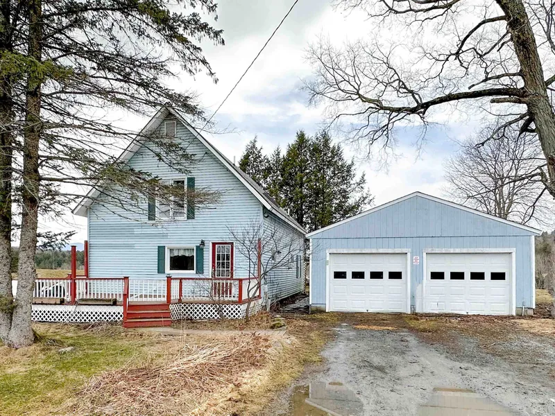 A lovely converted school house that overlooks picturesque Vermont farmland. The upstairs has two bedrooms, a primary suite with a walk in closet and a private balcony. The first floors open concept includes a beautiful kitchen, an additional bedroom and a second full bath. The dining/living room has direct access to a secluded back deck where you can sit and enjoy the incredible sunsets around a fire pit. The two car garage has a workshop addition on the back. One bay of the garage has been converted to a home office with heat and air condition. Perfect for working at home. This property has several established flower gardens and endless mountain views. Roughly 30 minutes to both Stowe and Smugglers Notch ski areas less than 15 Minutes to Northern Vermont University. The new owner can feel comfortable knowing that the roof and septic system are roughly 3 years old.
