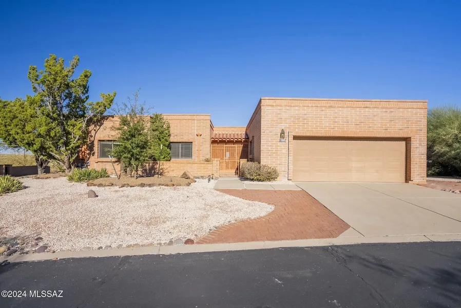 This stunning 2-bedroom,1-den, 2-bathroom Territorial-style home offers the perfect blend of comfort, luxury, and breathtaking views. Upon entering the open concept living and dining area you will notice the gas-burning beehive fireplace, and wet-bar perfect for cozy gatherings. The spacious kitchen has ample cabinet space, and plenty of natural light from the large skylights. The primary bedroom is generously sized, with a walk-in closet, and private backyard access. As you step outside onto the covered patio area, you will immediately be greeted by the panoramic sight of the Santa Rita Mountains. The yard is professionally landscaped all around, with decorative rock, pavers, fruit trees, and desert plants. This home sits on a very quiet street, next to the walking trail, which is