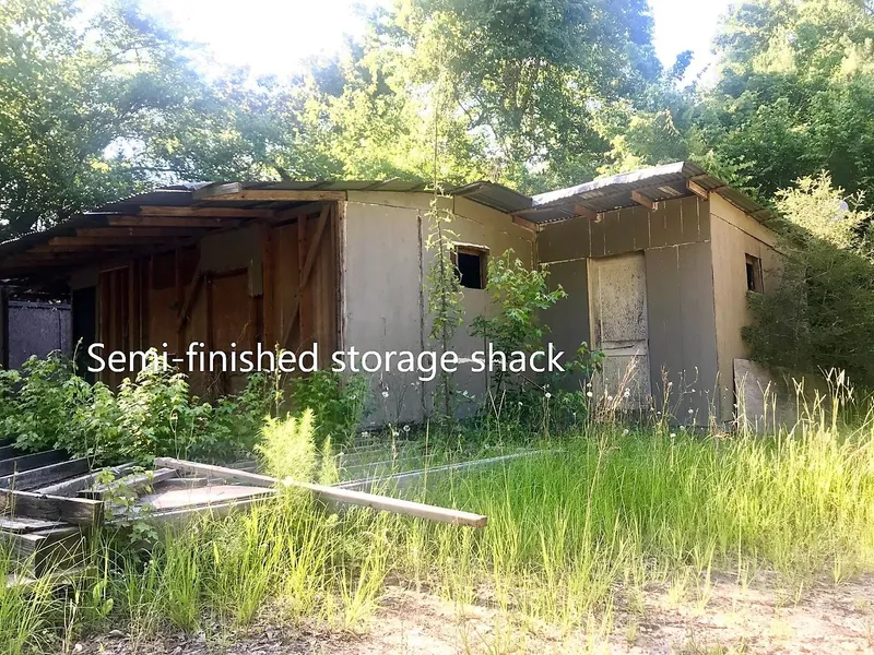 There is a semi-finished storage shack (approximately 1456 square feet) that comes with this land that needs repairs. There are existing electric plugs, sewer, and water access on the property. There are 2 satellite TV dishes on the roof. We are selling this land for land value only, buyer will become the new owner of the land + storage shack.