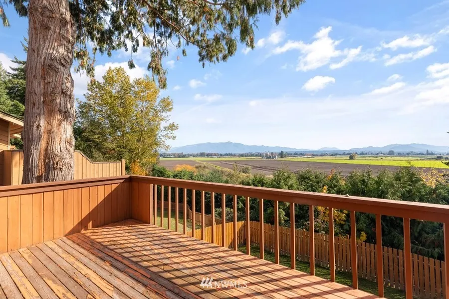 Stunning views of Skagit valley farmland & Mount Baker from this beautiful home in the Skagit Golf & Country Club neighborhood. This 2,604 sqft home has a large Master suite on the main w updated bath & a view! Stunning kitchen w a new Jenn-Air range, butcher block counter, & spacious cabinets. Dining room. Family room w a slider to the deck to bring living outside! Gorgeous vaulted cedar ceilings & two story stone fireplace! Lower level boasts large family room, 2 bed & office, utility room & bath. Fully fenced yard. Spacious garage w a loft workshop. Updates include newer flooring, newer windows, new cellular blinds, updated fixtures, new HVAC w Air conditioning, new smart water heater. Desirable location & move in ready...Welcome home!