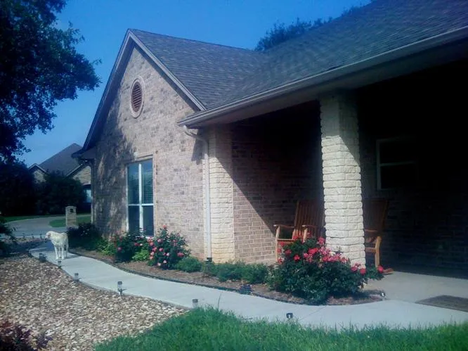 The four-year-old three bedroom, two bath brick home sits on a large, tree covered corner lot with golf course views front and back. The low-maintenance yard is bordered in back with a black wrought iron fence. It is landscaped with river rock, limited areas of bermuda and St. Augustine grass, and prepared flower beds filled with knockout roses. A sprinkler system is set up for grassy areas, trees, and plants.