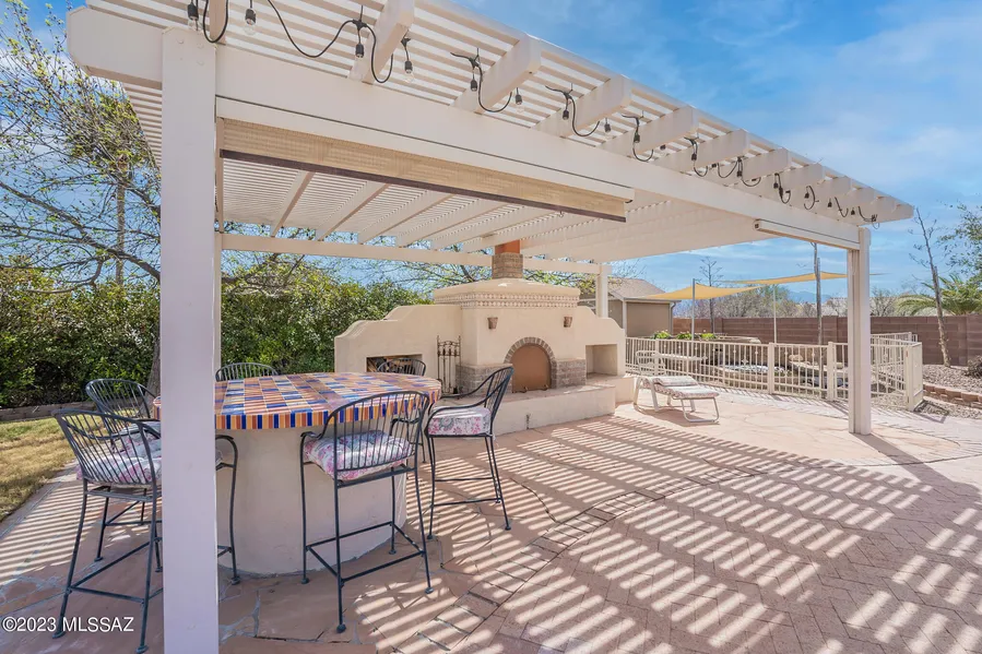 A Well Maintained Home, positioned at the end of the Cul De Sac, Features include Owned Solar Panels, Wood Tile Flooring throughout, Plantation Shutters, Whole House Circulation Fan, Ceiling Fans throughout, Updated Kitchen with Quartz Counter Tops, Breakfast Bar and Pre Area, Tasteful Kitchen Back Splash, Stainless Appliances, Pantry and Counter Pull Out Drawers, Water Filtration System, Screen-In Back Patio, Large East facing Back Yard with Ramada, Outdoor Wood Burning Fire Place, Water Garden, Fruit Orchard & raised garden area, Solar Heated Pool and Pool Shed, Additional Side Yard next to garage with double gate, Mountain Views and back yard adjacent to green belt area.