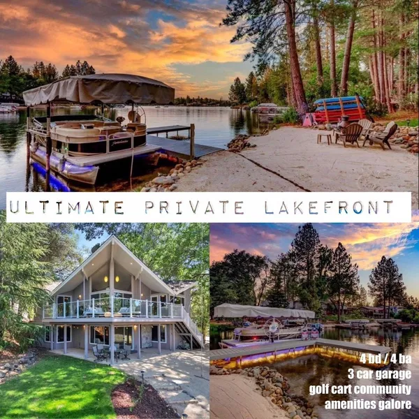 Dramatic Contemporary home nestled on a level LAKEFRONT parcel on a rare, deep-water cove! Each room faces the Lake or open space, offering beautiful views and more privacy than most lakefronts. Breathtaking architecture enhances the homes' style and charm! The formal entry captures your heart the minute you walk into the great room with soaring open beam ceilings, travertine floors and access to a huge surrounding deck overlooking the lake. Gourmet kitchen with Dacor cooktop, stainless appliances, and loads of counter space. Romantic, primary bedroom with deck access, theater system, double-head shower, double sinks, and walk-in closet. Second primary bedroom is a lovely sanctuary accessed through the large, lofted bonus room. It has a 60' private beach with a new Trex dock, boat lift. Downstairs has two oversized bedrooms and theater room with in-wall speakers and surround sound. 3 new Trex decks and a 3-zone HVAC system. Enjoy a large circular driveway, oversized three car garage, and only six steps up to the main level. LOP is a gated Golf Cart community.